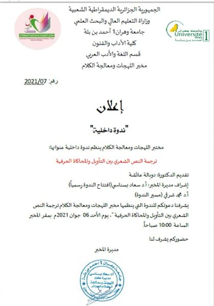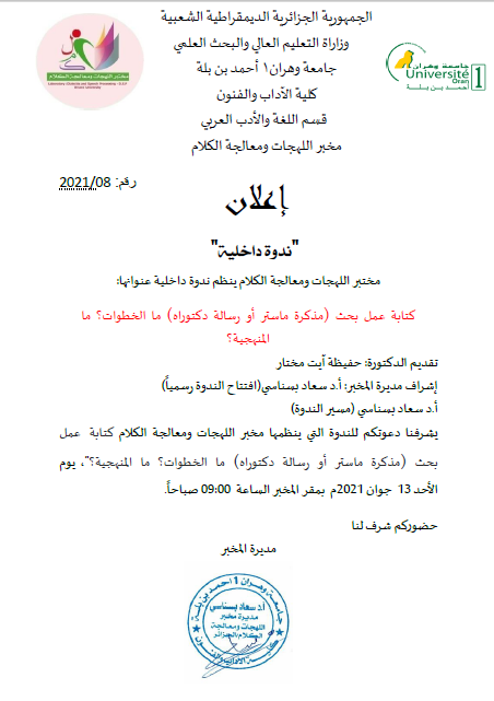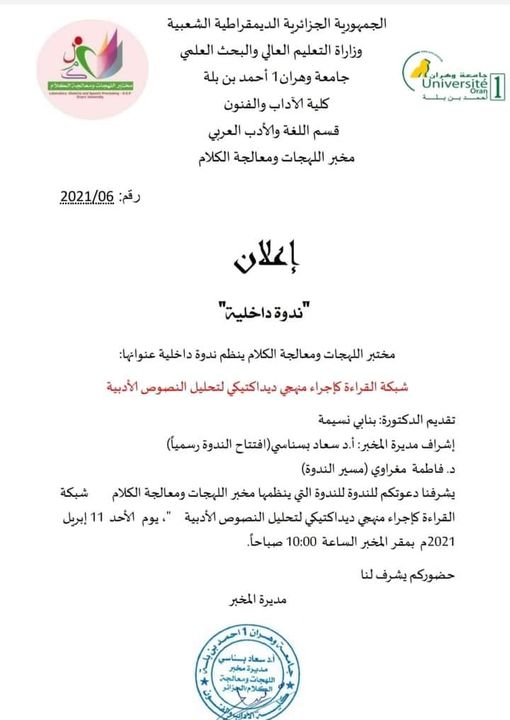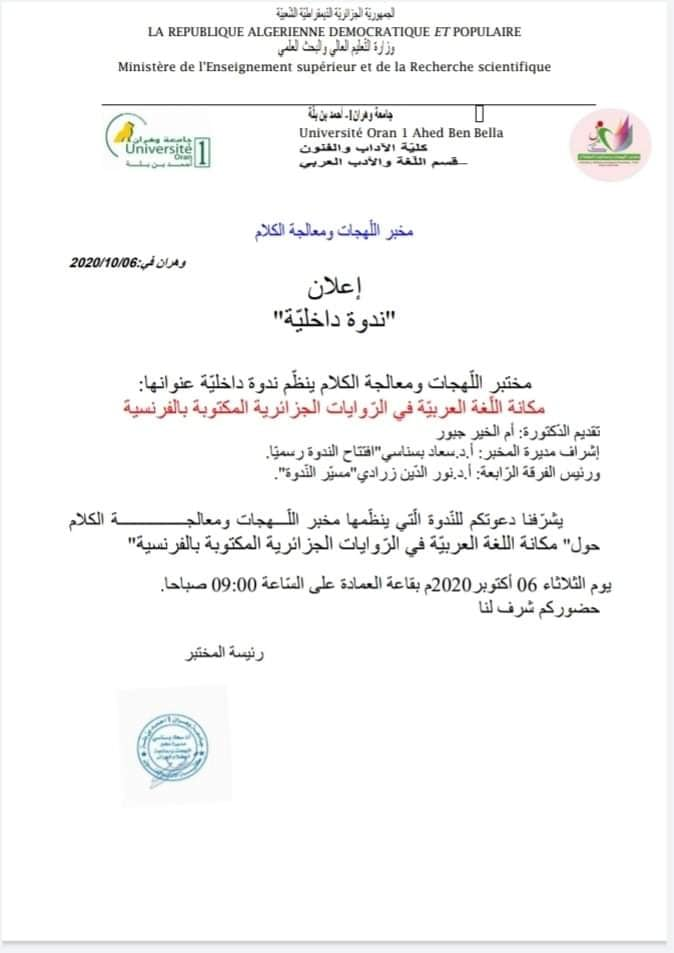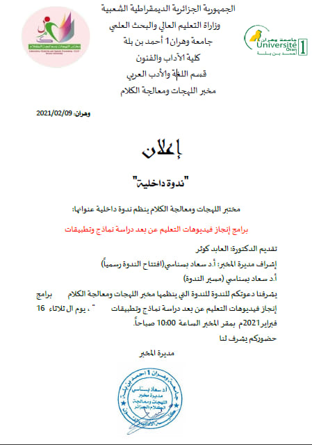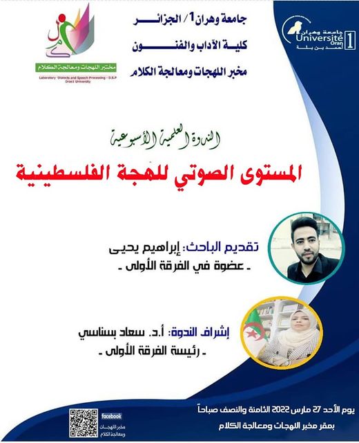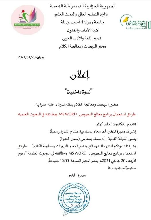 تمّ اعتماد (مخبر اللّهجات ومعالجة الكلام) وزاريا بمرسوم سنة 2014 وهو أحد مخابر كليّة الآداب بجامعة وهران1 بإشراف البروفيسور مكي درار، واشتغل لمدّة سنتين في عدّة اتّجاهات لتحقيق الأهداف المسطرة فتم تنظيم ملتقيات دولية ووطتية وندوات وأيام دراسية وطبع كتب لأعضاء المخبر منهم كتاب دراسة لسانية للمباني الإفراديّة للأستاذة سعاد بسناسي، وسنة 2016 تولّت الأستاذة سعاد بسناسي إدارة المخبر ومواصلة تنفيذ خطّة العمل لتسيير المخبر وتحقيق مشاريعه على رأسها إصدار مجلّة علميّة محكّمة (الكَلم) وتمّ ذلك بإصدار أول عدد سنة 2016 وانتظمت المجلّة بإصداراتها الدّورية السداسية إلى أن تم وضعها في منصة المجلات الجزائرية الإلكترونية ASJP وتم تصنيفها ضمن صنف ج، وكذلك توالت نشاطات المخبر لتنظيم المؤتمرات الدولية والوطنية والندوات والورشات التكوينية للطلة خاصة في البحث العلمي وإعداد مقال للنشر ومنهجية البحث، وطبع جملة من الكتب الجماعية بأرقام إيداع دولية وغيرها من المواضيع. ويقوم المخبر على أربعة فرق وهي: